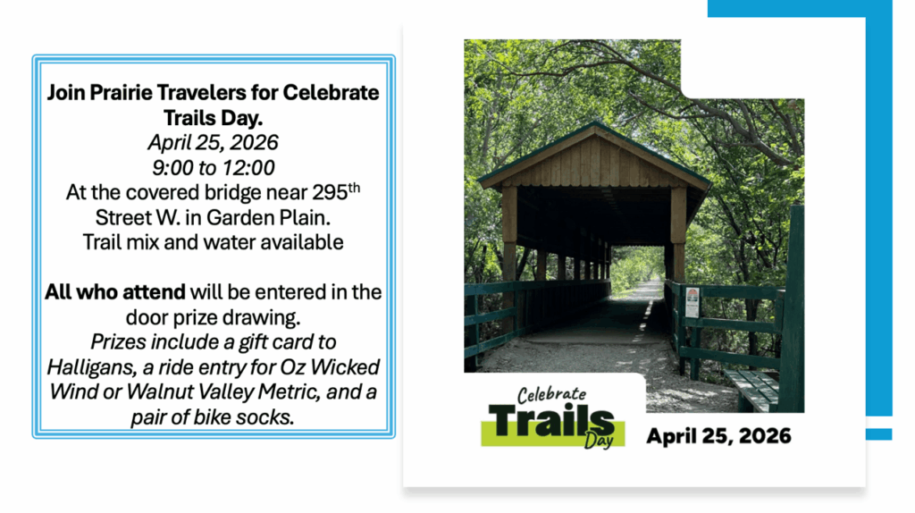Mark your calendars for our Annual Board nomination and elections on Jan 14th, 2026 and our Annual Board meeting, Feb 11th, 2026. Welcome to join, 7:00 pm at Bike Walk Wichita, 325 N St Francis.